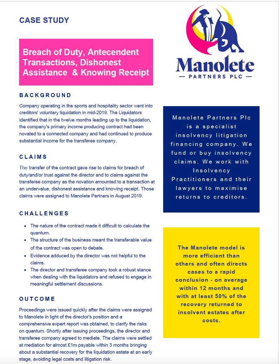 In addition, Manolete obtained judgment in the matter of Just Recruit Group Limited - (In Administration). Manolete Partners PLC v Norman Freed & Ors [2024].