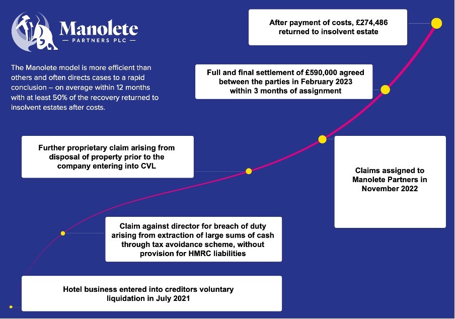 At Manolete, we firmly believe in showcasing the real impact and success stories behind our work. These anonymised case studies shed light on the transformative power of our model, demonstrating a proven track record of achieving great outcomes in litigation. We can breathe new life into insolvency legal claims, enabling insolvent estates to recover maximum value and achieve favourable settlements. With Manolete by your side, you can navigate the legal landscape with confidence and reap the rewards of our tailored approach.
